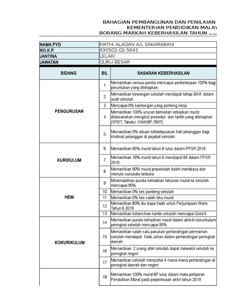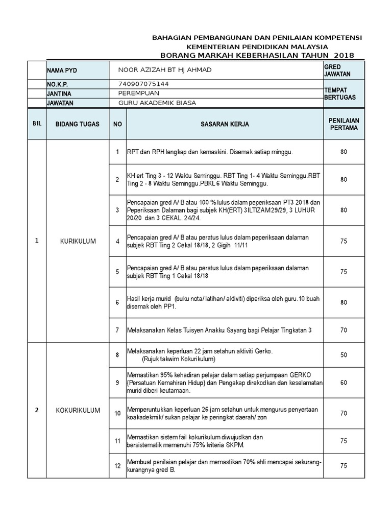 Borang Keberhasilan Contoh Penulisan Bk Xlsx Penilaian Bersepadu Pegawai Perkhidmatan Pendidikan Borang Keberhasilan Tahun 2018 Nama Pyd Norhaslina Course Hero