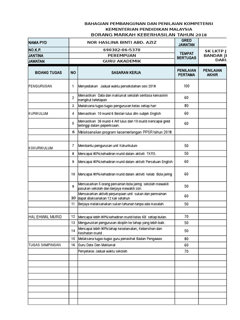 730510-10-5676 JAWATAN GURU AKADEMIK BIDANG TUGAS NO SASARAN KEBERHASILAN GURU MP MATEMATIK 1 90 2 85 3 90 4 94 5 90 6 86 7 80 8 85 9 85 10 84 11 86 12 87. BORANG MARKAH KEBERHASILAN TAHUN2016 NAMA PYD MOHD FAIZ BIN ZORKARNAIN NOKP. Penilaian keberhasilan merupakan salah satu komponen dalam Penilaian Bersepadu Pegawai Perkhidmatan Pendidikan PBPPP.